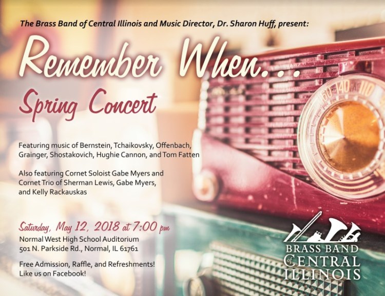 The Brass Band of Central Illinois will present its annual spring concert entitled “Remember When…” at 7:00 pm on Saturday, May 12, 2018. The concert will be held in the auditorium of Normal West High School, 501 North Parkside Road, in Normal, Illinois.